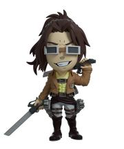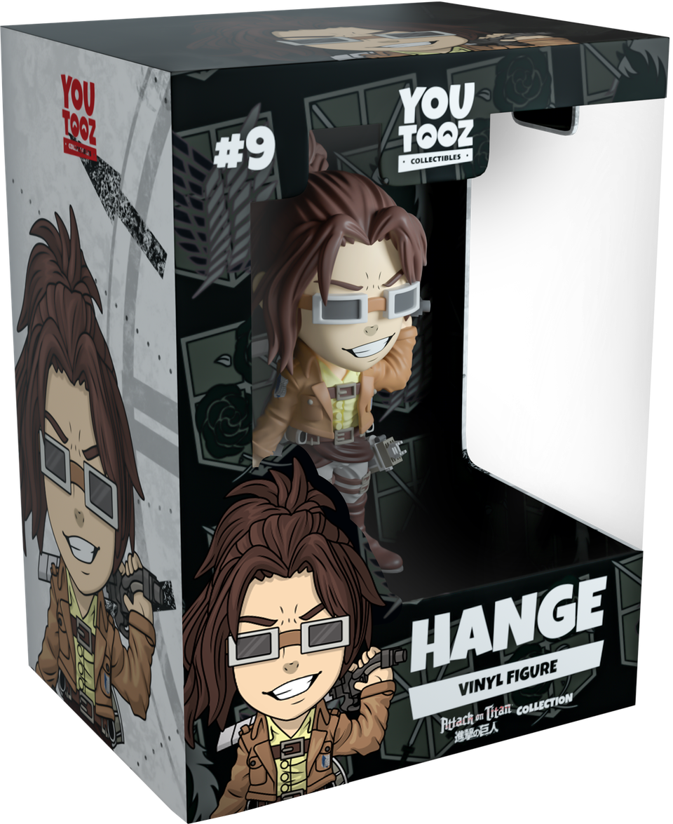 Hange Zoe, the survey Corps head of titan experiment and research, stands confidently at 5-inches tall. One of her swords rests casually over her left shoulder, while the other is flicked out to the side. Her long messy brown hair is pulled into a high ponytail and her face displays furrowed brows and a big excited grin. Her glasses are held firmly in place with three straps around the back of her head. She wears a light yellow collared shirt underneath her brown and white Survey Corps uniform and her grey ODM gear. The exterior of his packaging resembles the map of the walls used in the manga. While the interior pattern shows the three military regiment insignias in a grey repeating across a black background. The protective sleeve displays a closer view map encompassing the packaging. This collectible ships in a matte, embossed, protective outer sleeve and a custom sized plastic protector for maximum protection during shipping.