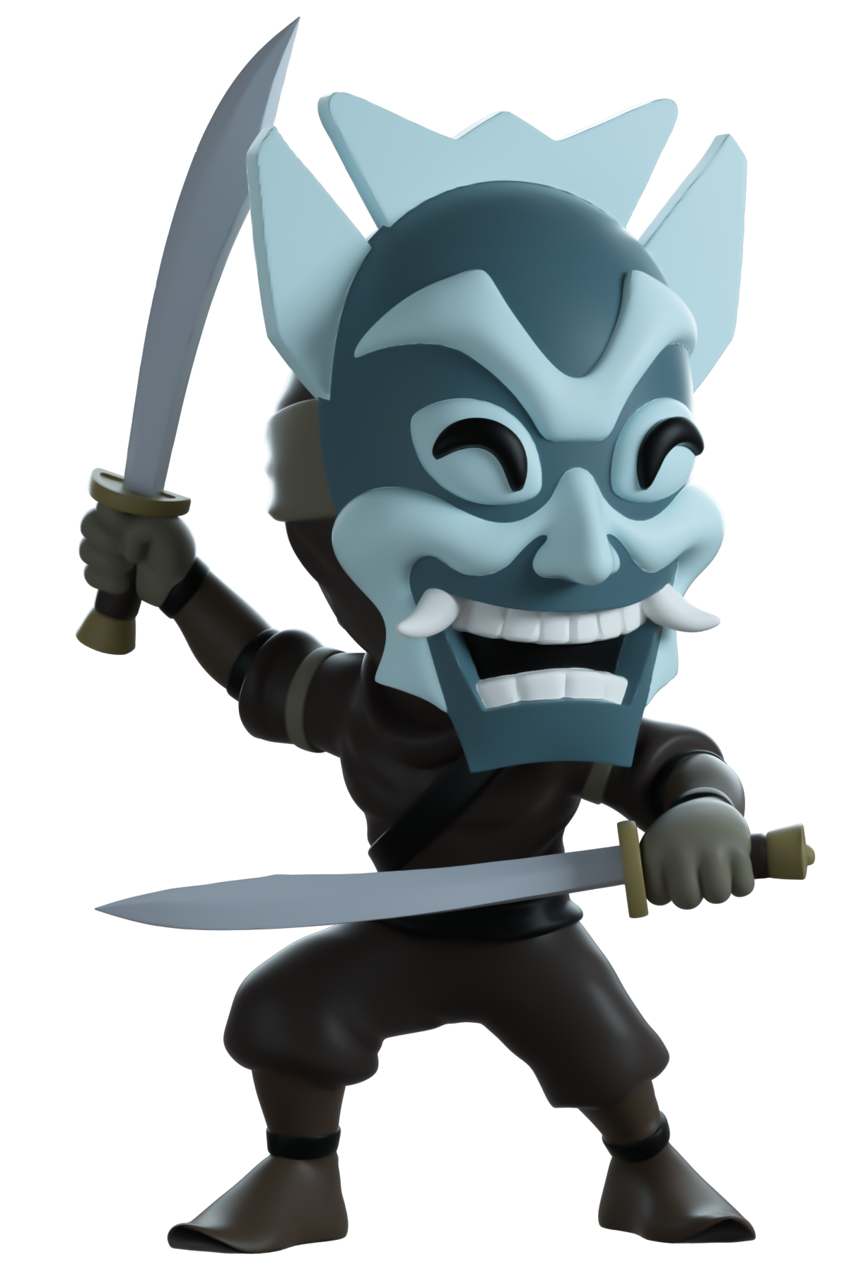 Standing at 4.8 inches, the Blue Spirit arrives at Youtooz. He is dressed with a long sleeved brown shirt and matching pants. Both of his arms are posed in a defensive stance as they both wield sharp swords. Covering his face is a blue mask that is strapped on his head with 3 straps tied behind him. The smile on the mask showcases a full set of teeth with two sharp fangs that stick out. The exterior of his double-walled packaging shows a beautifully illustrated scene during the nighttime, with Blue Spirit's silhouette on the move. The protective sleeve is a drawing of all 4 elements. This collectible ships in a matte, embossed, protective outer sleeve and a custom sized plastic protector for maximum protection during shipping.