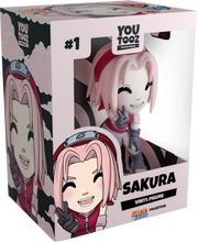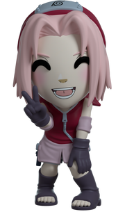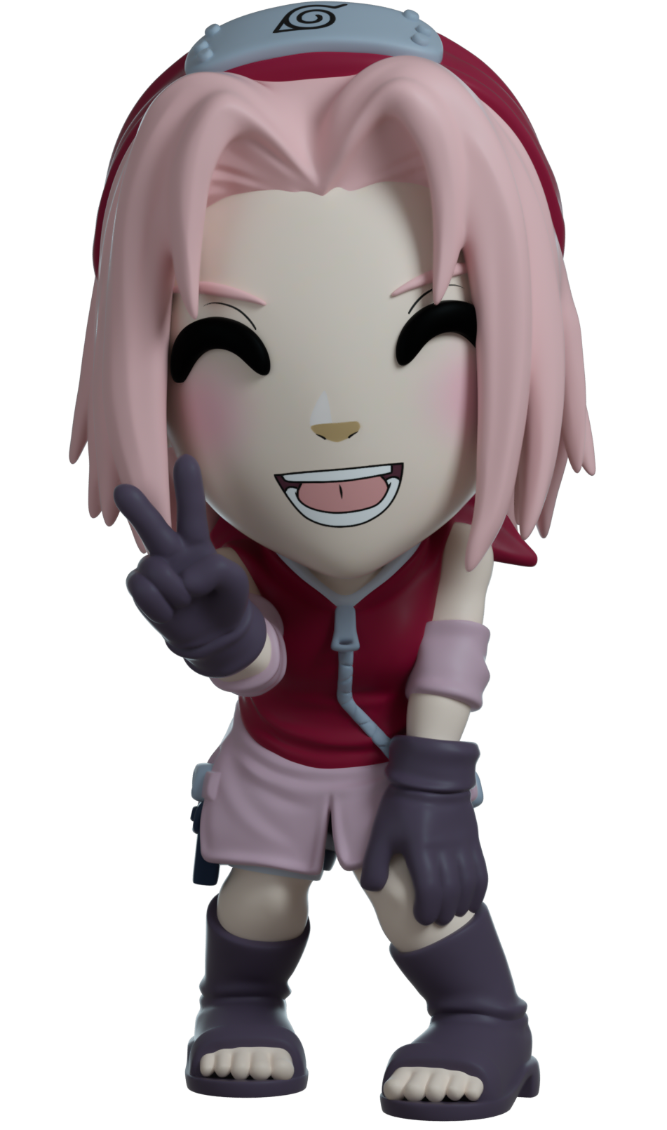Sakura makes her Youtooz debut and is ready to heal the team! At almost 4-inches tall, she’s posed bending forward with an outstretched gloved hand making the peace sign while the other rests on her knee. A dark pink konoha headband sit atop her bright sakura pink hair, which falls down to surround her adorable rosy cheeked smiling face. She’d dressed in a dark pink sleeveless vest that zips up at the front and a light pink split skirt over shorts, with matching pink arm bands and brown open toe boots. The exterior of her packaging is covered in beautiful billowing pale pink clouds upon a black background. While the interior is a simple pattern of varying sized swirls. The protective sleeve carries the clouds around the exterior and is backed with the Naruto Shippuden logo. This collectible ships in a matte, embossed, protective outer sleeve and a custom sized plastic protector for maximum protection during shipping.