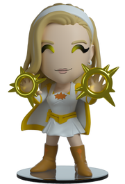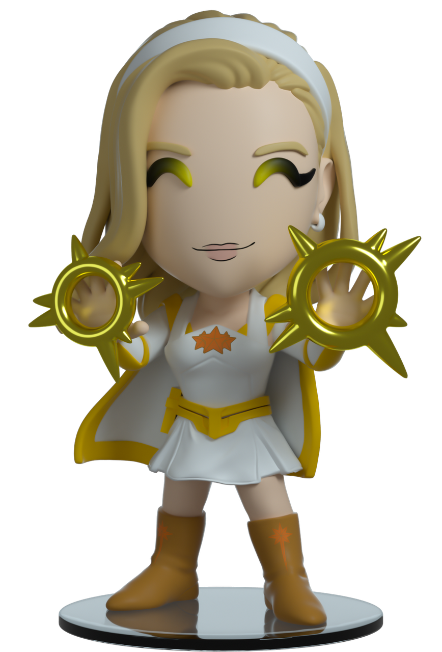 America's sweetheart has made her way from the pageant stage, to the Seven and now into Youtooz! Standing at 4 1/2-inches tall she's posed with her arms outstretched letting loose two dazzling rings of light for her open palms as her eyes glow with a golden shimmer. Knowing she has the upper hand, a cute smirk crosses her lips as her long blonde hair falls elegantly down in a pushed back fringe and is held in place with a white headband. Wearing her original costume of a white long sleeve dress with long sleeves and yellow embellishments, her star patterned cape flows gracefully in the wind. The exterior of her packaging sees Starlight through the close up lens of a camera. While the interior surrounds her in a graffiti scrawled white brick wall, this then continues onto the protective sleeve with the wall splattered in blood and printed with The Boys logo on the rear. This collectible ships in a matte, embossed, protective outer sleeve and a custom sized plastic protector for maximum protection during shipping.